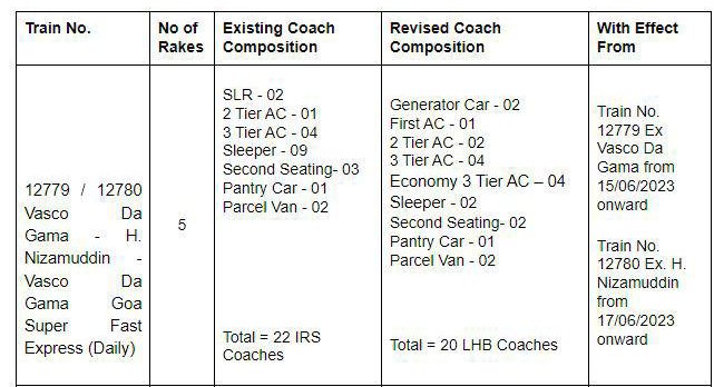 हाल ही में 12779/80 वास्को डि गामा हज़रत निजामुद्दीन वास्को डि गामा सुपरफास्ट एक्सप्रेस के LHB करण और गाड़ी संरचना के मानकीकरण की खबर आई थी। 15 जून 2023 से यह कोच मानकीकरण लागू होगा। मानकीकरण में गोवा एक्सप्रेस के 09 स्लीपर और 03 द्वितीय श्रेणी की संख्या घटकर मात्र 02 स्लीपर और 02 ही द्वितीय श्रेणी कोच रह जायेगी।