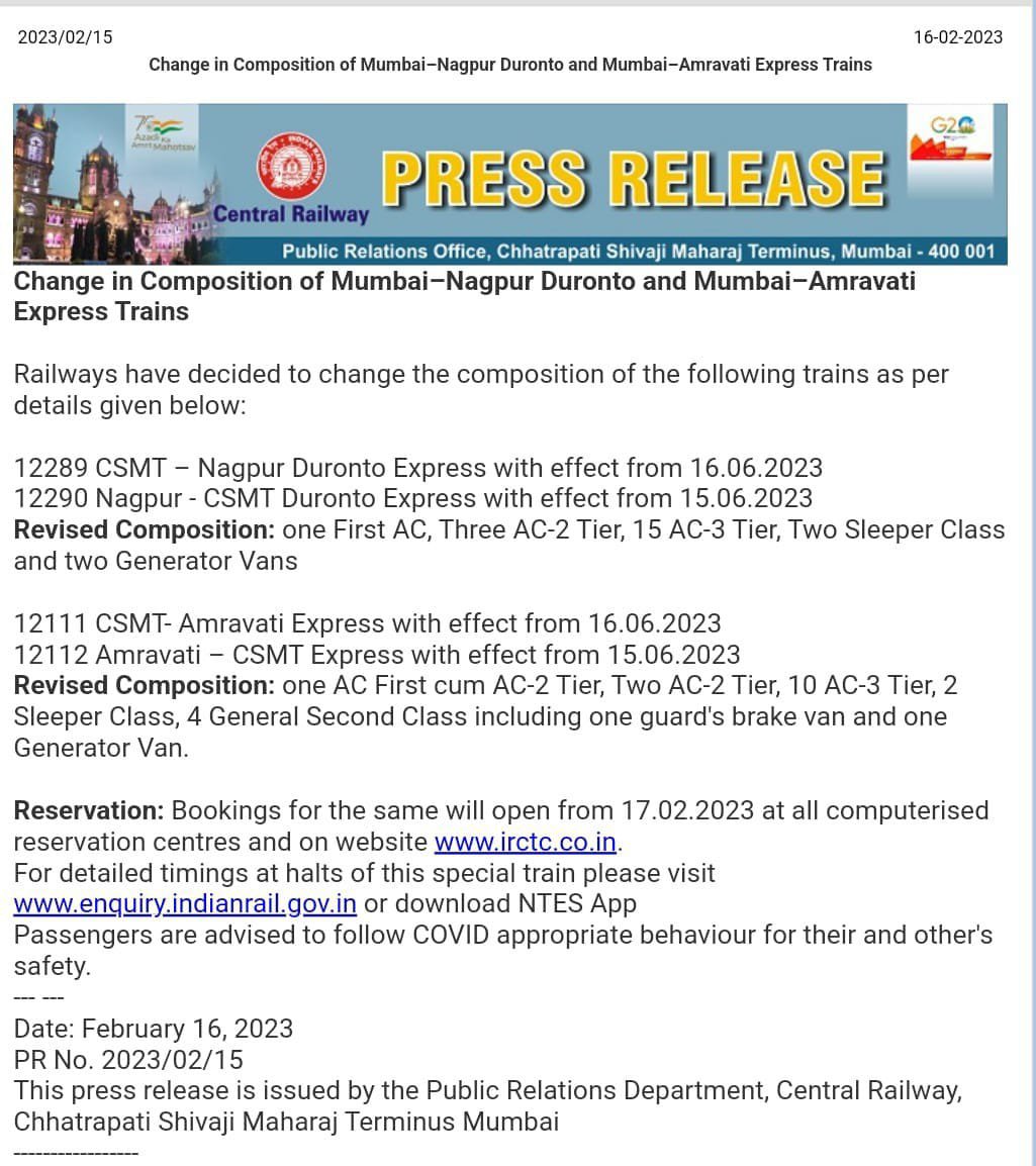 ठीक इसी तरह की कोच संरचना 12289/90 छत्रपति शिवाजी महाराज टर्मिनस मुम्बई – नागपुर के बीच प्रतिदिन चलनेवाली दुरन्तो एक्सप्रेस और 121121/12 छत्रपति शिवाजी महाराज टर्मिनस मुम्बई – अमरावती के बीच चलनेवाली प्रतिदिन अम्बा एक्सप्रेस के साथ होने जा रहा है। 15 जून 2023 से यह कोच मानकीकरण लागू होगा। मानकीकरण में दुरन्तो एक्सप्रेस के 08 स्लीपर की संख्या घटकर मात्र 02 स्लीपर कोच रह जायेगी। 12111/12 अम्बा एक्सप्रेस में 08 स्लीपर और 02 द्वितीय श्रेणी कोच की संरचना बदलकर मात्र 02 स्लीपर एवं 04 द्वितीय श्रेणी कोच की की जा रही है। निम्नलिखित परिपत्रक देखें,