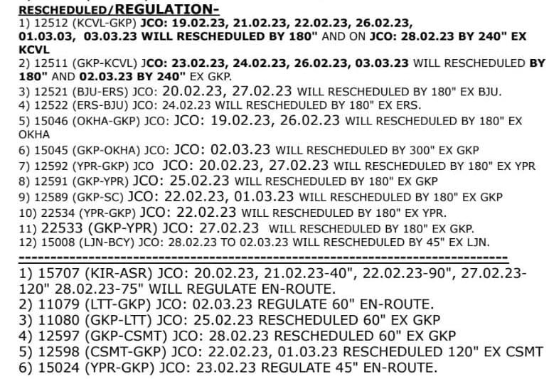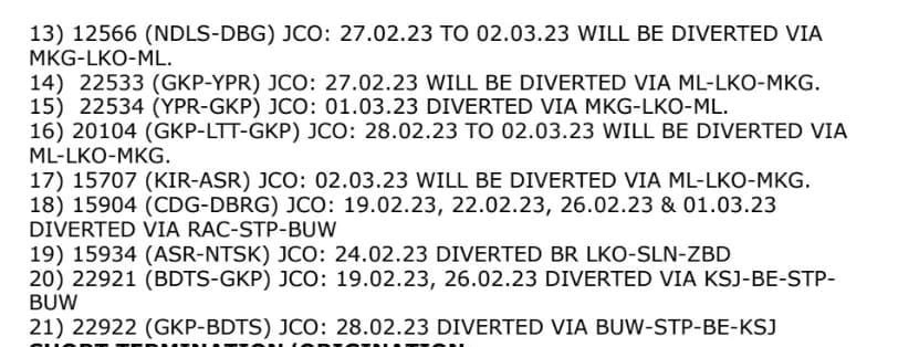 उत्तर रेल्वे NR के लखनऊ मण्डल में डालीगंज – मल्हौर स्टेशनों के मध्य रेल दोहरीकरण कार्य हेतु प्री-नाॅन इंटरलाॅक, नाॅन इंटरलाॅक व रेल संरक्षा आयुक्त के निरीक्षण के परिपेक्ष में गाड़ियों का निरस्तीकरण, मार्ग परिवर्तन, शार्ट टर्मिनेशन/शार्ट ओरिजिनेशन, नियंत्रण व पुनर्निधारण किया गया है।