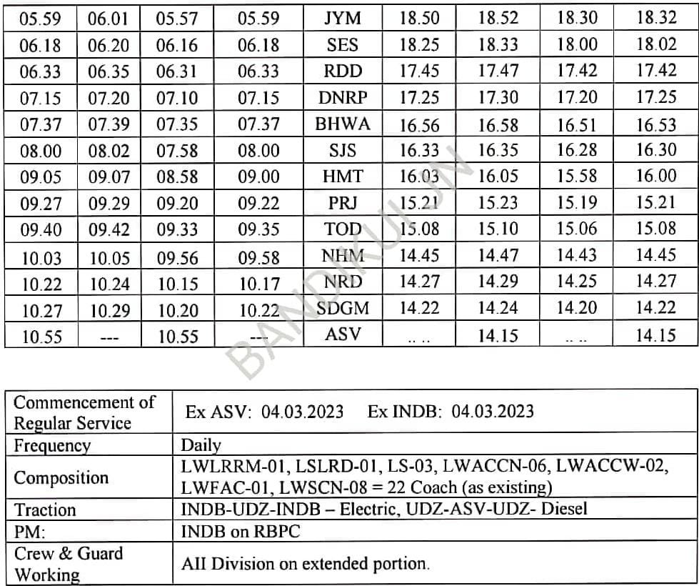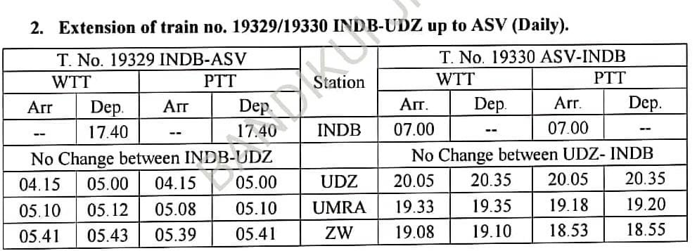 19329/30 इन्दौर उदयपुर सिटी इन्दौर वीर भूमि प्रतिदिन एक्सप्रेस का उदयपुर सिटी से आगे असरवा तक विस्तार किया जा रहा है। यह गाड़ी दोनोंही दिशाओं से दिनांक 04 मार्च से असरवा और इन्दौर की बीच चलना शुरू हो जाएगी। वीर भूमि एक्सप्रेस के प्रतिदिन परिचालन में इंदौर से उदयपुर सिटी तक कोई समय परिवर्तन नही किया गया है।