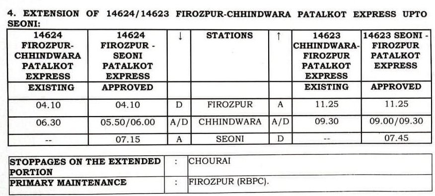 4) 14624/23 फिरोजपुर कैंट – छिंदवाड़ा – फिरोजपुर कैंट पातालकोट प्रतिदिन एक्सप्रेस का छिंदवाड़ा से आगे सिवनी तक विस्तार