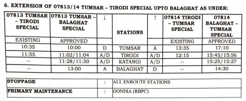 6) 07813/14 तुमसर – तिरोड़ी – तुमसर प्रतिदिन डेमू विशेष गाड़ी का कटंगी के रास्ते बालाघाट तक विस्तार