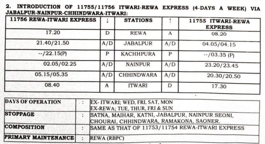 2) 11755/56 रीवा – इतवारी – रीवा सप्ताह में चार दिवसीय एक्सप्रेस वाया जबलपुर, नैनपुर, छिंदवाड़ा।