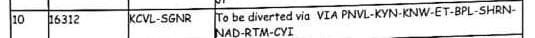 अब हुवा यूँ है, पश्चिम रेलवे के परिपत्र अनुसार 16312 कोचुवेळी – श्रीगंगानगर का मार्गपरिवर्तन कर भोपाल , उज्जैन , नागदा , रतलाम , छायापूरी होकर है लेकिन ये गाड़ी पनवेल से भुसावल होते हुए भोपाल, उज्जैन से फतेहाबाद, रतलाम तक आयी और अब छायापुरी, अहमदाबाद होकर मारवाड़ न जाते हुए चित्तौड़ ,अजमेर होकर मारवाड़ जा रही है।