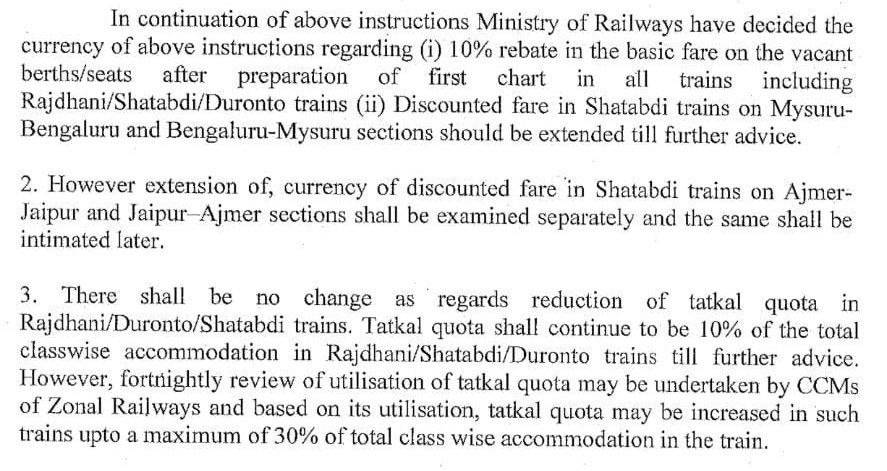 तकरीबन 8 वर्ष पहले रेल प्रशासन ने पहले चार्टिंग होने के बाद जो भी सीट्स या बर्थस अन बुक्ड अर्थात बिना बुकिंग के खाली रह जाती थी, यदि कोई यात्री उन्हें बुक करता है तो उनपर रेल्वेके मूल किराये का 10% छूट देने का नियम बनाया था। गाड़ी के मूल किराये के अलावा लगने वाले इतर शुल्क जैसे आरक्षण शुल्क, सुपरफास्ट चार्जेस इत्यादि यथावत लगाए जाते थे।