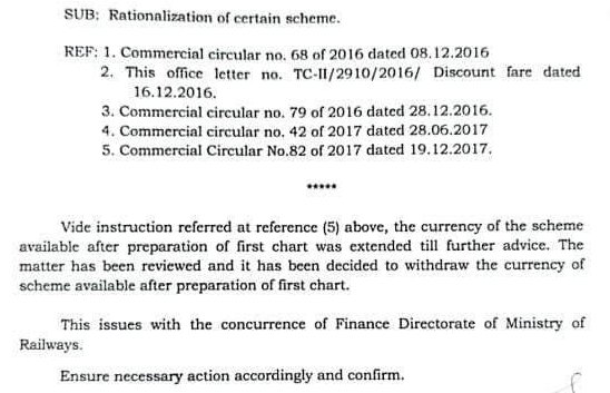 रेल प्रशासन द्वारा इस रियायत को खत्म करने का निर्णय लिया है। इस सम्बंध के परिपत्रक हम यहॉं दे रहे है।