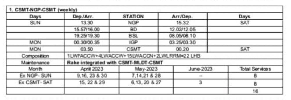 1: मुम्बई – नागपुर – मुम्बई साप्ताहिक वातानुकूलित विशेष