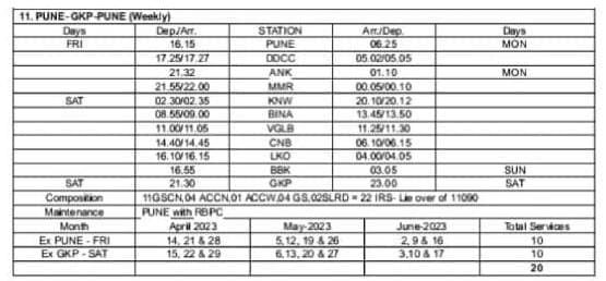 11: पुणे – गोरखपुर – पुणे साप्ताहिक विशेष वाया कानपुर, लखनऊ