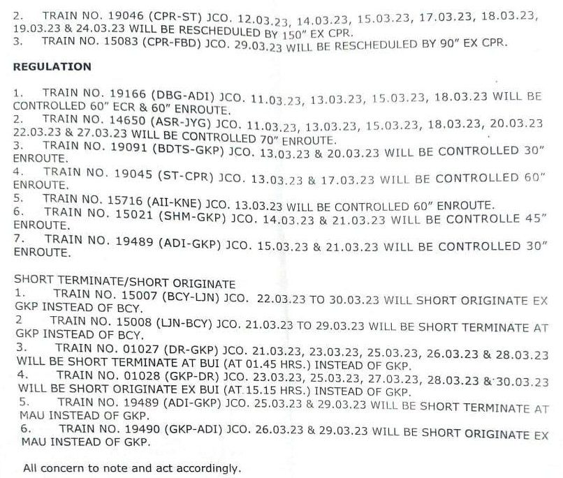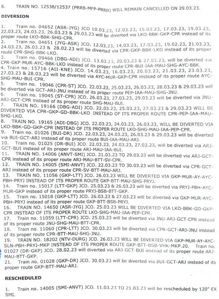उपरोक्त रेल ब्लॉक के चलते 5 जोड़ी गाड़ियाँ रद्द, 21 गाड़ियाँ परावर्तित रेल मार्गसे, 3 गाड़ियाँ नियमित समयसारणी की जगह बदले समयोंपर चलाई जाएगी और 6 गाड़ियाँ अपने नियमित ठहरावों, स्टोपेजेस पर मार्ग में नियंत्रित कर चलाई जाएगी।