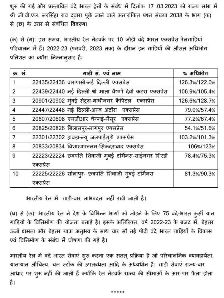 वन्देभारत एक्सप्रेस भारतीय रेल की महत्वाकांक्षी परियोजना है। हमारे प्रधानमंत्री खुद इसमे रस ले रहे है। साथ ही प्रत्येक रेल यात्री, विभिन्न क्षेत्र के सांसद अपने अपने क्षेत्र में वन्देभारत एक्सप्रेस चलें इसके लिए आग्रही है। संसद में वन्देभारत एक्सप्रेस के परिचालन के बारे में चर्चाएं, प्रश्नोत्तर भी आते रहते है। हाल ही में, राज्यसभा सांसद जी वी एल नरसिम्हा राव जी ने रेल मंत्रालय से वन्देभारत एक्सप्रेस के बारे में कुछ प्रश्न किये। यह प्रश्न सभी रेल यात्रिओंके मन मे भी उठते रहते है। आशा है, रेल मंत्रालय के विस्तृत उत्तर के कारण, हम सभी रेल यात्री और रेल और रेल प्रेमियों की उत्सुकता का शमन होगा।