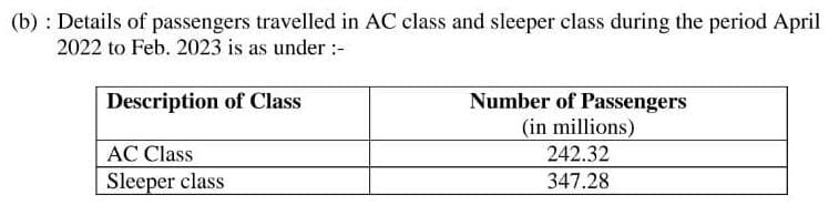 आम रेल यात्रिओंमें स्लीपर कोच बहुत लोकप्रिय है। यह आरक्षित श्रेणी यात्रिओंको लम्बे, मंझौले रेल यात्रा के लिए काफी किफ़ायती और ज्यादा सुविधाजनक लगती है। वहीं द्वितीय श्रेणी अनारक्षित कोच का लम्बे अंतर की रेल यात्रा में क्या औचित्य है यह समझ से बाहर है। जब हम रेल विभाग द्वारा जारी आँकड़े देखते है तो पता चलता है, तकरीबन 90% रेल यात्री अनारक्षित टिकट लेकर यात्रा करते है। निम्नलिखित चार्ट देखिए,