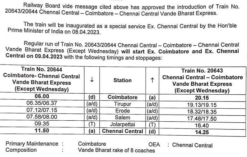 20644/43 कोयम्बटूर चेन्नई सेंट्रल कोयम्बटूर वन्देभारत एक्सप्रेस सप्ताह में छह दिन, प्रत्येक बुधवार को छोड़कर चलेगी। दिनांक 08 अप्रैल को माननीय प्रधानमंत्री जी इसका उद्धाटन चेन्नई सेंट्रल से करेंगे और दिनांक 09 अप्रैल से वन्देभारत की नियमित दौड़ शुरू होगी।