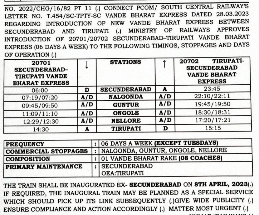 20701/02 सिकंदराबाद तिरुपति सिकंदराबाद वन्देभारत एक्सप्रेस सप्ताह में छह दिन, प्रत्येक मंगलवार को छोड़कर चलेगी। दिनांक 08 अप्रैल को सिकंदराबाद से उद्धाटन होगा। उद्धाटन विशेष गाड़ी की सूचना अलग से जारी की जाएगी।