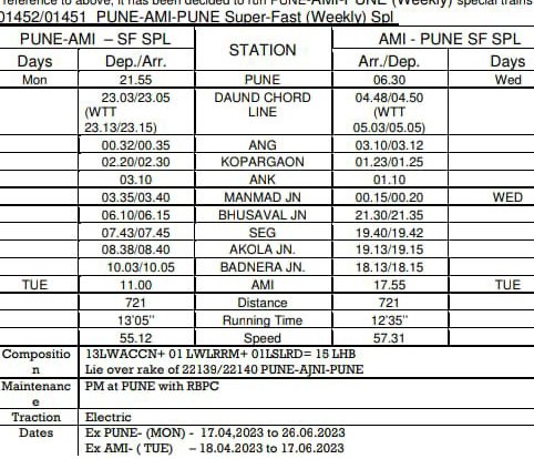 01452 पुणे अमरावती साप्ताहिक विशेष पुणे से दिनांक 17 अप्रैल से 26 जून तक प्रत्येक सोमवार को निकलेगी और वापसीमे 01451 अमरावती पुणे साप्ताहिक विशेष 18 अप्रैल से 27 जून तक प्रत्येक मंगलवार को अमरावती से निकलेगी।