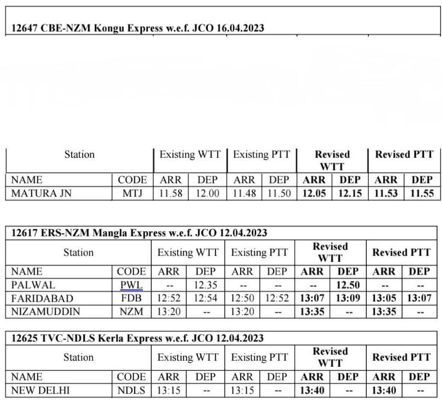 12647 कोयम्बटूर निजामुद्दीन कोंगु एक्सप्रेस, 12617 एर्नाकुलम निजामुद्दीन मङ्गला एक्सप्रेस, 12625 तिरुवनंतपुरम नई दिल्ली केरल एक्सप्रेस