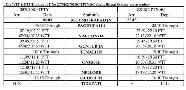 यात्रीगण, ध्यान दीजिए। 20701/02 सिकंदराबाद – तिरुपति – सिकंदराबाद वन्देभारत की समयसारणी में कुछ बदलाव किया गया है। साथ इस वन्देभारत एक्सप्रेस के समयसारणी को नियमित रखने के लिए, पूर्वचलित नियमित गाड़ियोंका समय भी बदला जाना है। गौरतलब यह है, नियमित मेल/एक्सप्रेस गाड़ियोंके सारे बदलाव वर्किंग समयसारणी WTT में किये जा रहे है, जो यात्रिओंके उपयोग की समयसारणी PTT पब्लिक टाइम टेबल पर असर नही करने वाले है।