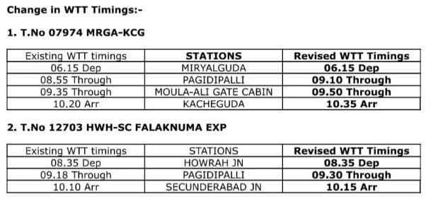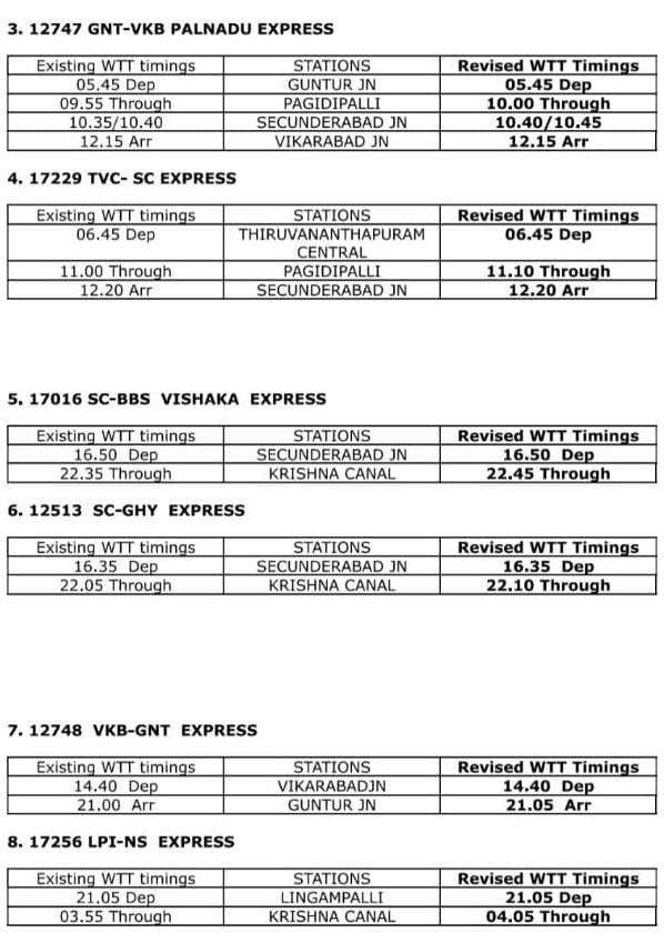 निम्नलिखित गाड़ियोंके WTT वर्किंग समयसारणी मे बदलाव किया जा रहा है। यात्रीगण की समयसारणी PTT में कोई बदलाव नही होगा।