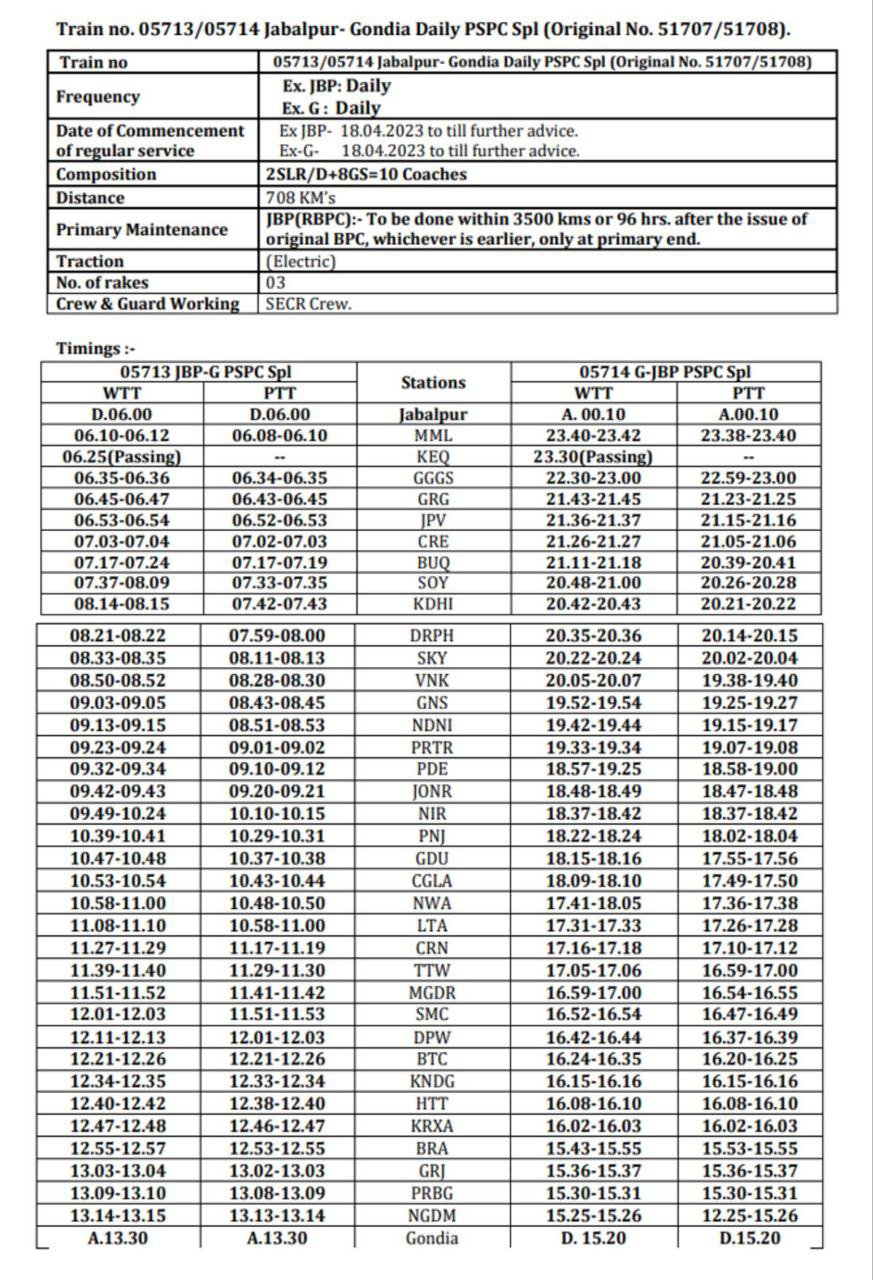 05713/14 जबलपुर गोंदिया जबलपुर प्रतिदिन विशेष गाड़ी दिनांक 18 अप्रैल से शुरू की जा रही है। गाड़ी की संरचना 08 द्वितीय श्रेणी साधारण और 02 एसएलआर कुल 10 कोच की रहेंगी। यात्रीगण ज्ञात रहे, संक्रमण पूर्व 51707/08 जबलपुर गोंदिया जबलपुर सवारी गाड़ी का ही यह विशेष संस्करण है और विशेष होने के नाते किराये भी मेल/एक्सप्रेस के लगने सम्भावना है। 😊