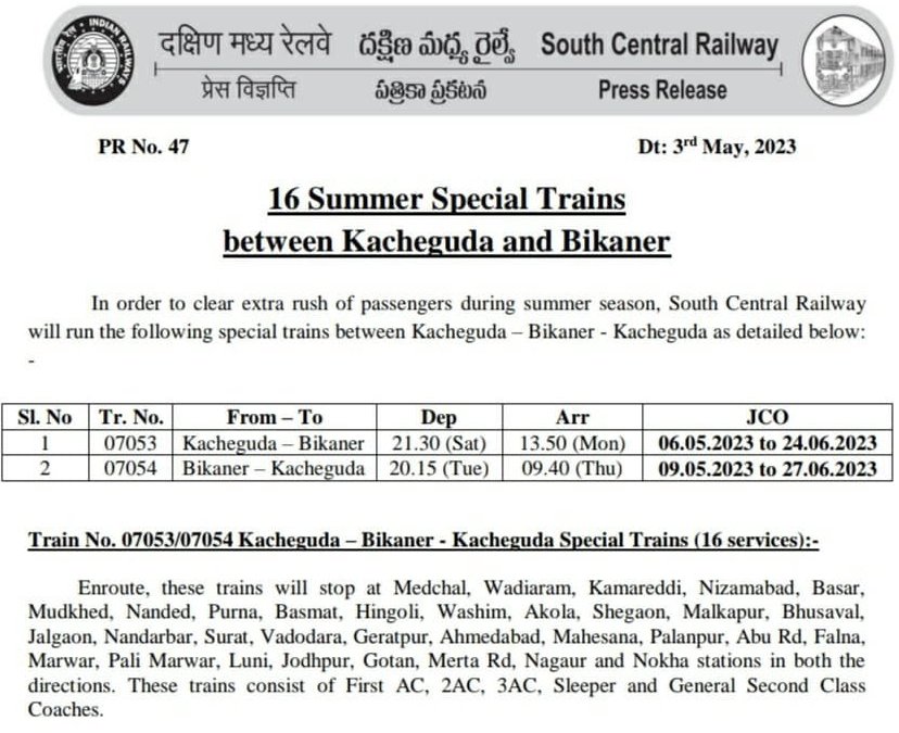 07053/54 काचेगुड़ा – बीकानेर – काचेगुड़ा साप्ताहिक विशेष वाया निजामाबाद, मुदखेड़, नान्देड़, पूर्णा, अकोला, भुसावल, जलगाँव, सूरत, अहमदाबाद, अबु रोड, मारवाड़, जोधपुर, मेड़तारोड, नागौर होकर बीकानेर चलेगी।