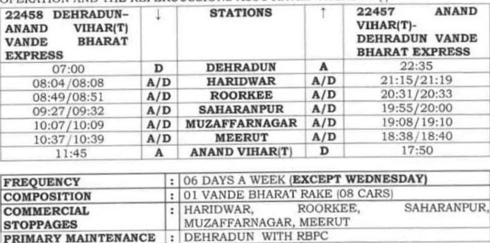 22458 देहरादून आनन्द विहार टर्मिनल वन्देभारत और 22457 आनन्द विहार टर्मिनल देहरादून वन्देभारत एक्सप्रेस सप्ताह में छह दिन, प्रत्येक बुधवार छोड़कर दिनांक 25 मई से देहरादून से चल पड़ेगी।