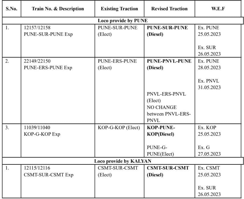 अब चलिए आप को बताते है, कौनसी 5 जोड़ी गाड़ियाँ डीज़ल लोको से खींची जानी है। अर्थात यह सारी व्यवस्था अस्थायी है। जल्द ही विशेष गाड़ियोंका दौर खत्म होगा और इलेक्ट्रिक लोको फिर अपनी गाड़ियोंको खींचने उपलब्ध हो जाएंगे।