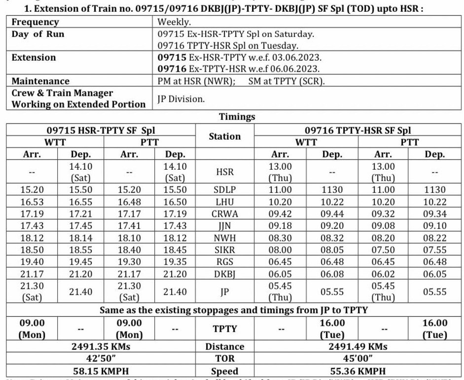 निम्नलिखित परिपत्रक में विस्तारित मार्ग की समयसारणी दी जा रही है। ढहर का बालाजी से तिरुपति साथ ही साईं नगर शिर्डी के बीच शेड्यूल में किसी प्रकार का बदलाव नहीं किया गया है।