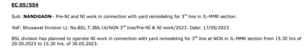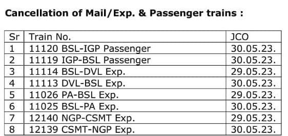 दिनांक 29 मई की दोपहर 15:30 से 30 मई की दोपहर 15:30 तक अर्थात 24 घण्टे का रेल ब्लॉक लिया जा रहा है। इस समय के दौरान निम्नलिखित गाड़ियाँ रद्द/आँशिक रद्द/मार्ग परिवर्तन और नियंत्रण कर चलाई जाएंगी। JCO का अर्थ होता है ‘जर्नी कमिन्स ऑन’ अर्थात गाड़ी के प्रारंभिक स्टेशन से चलने की तिथि
