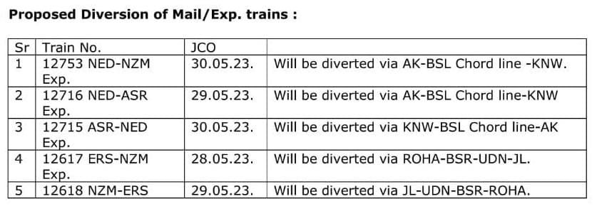 12715 नान्देड़ अमृतसर सचखण्ड एक्सप्रेस JCO 29/5/2023 अपने नियमित मार्ग की जगह नान्देड़ – अकोला – भुसावल बाईपास कोर्ड से बुरहानपुर से अपने नियमित मार्ग से आगे अमृतसर की ओर चलेगी। इस दौरान अपने नियमित स्टॉपेज पूर्णा, परभणी, सेलु, जालना, सम्भाजी नगर, मनमाड़, चालीसगांव, पाचोरा, जलगाँव एवं भुसावल स्टेशंस स्किप होंगे।