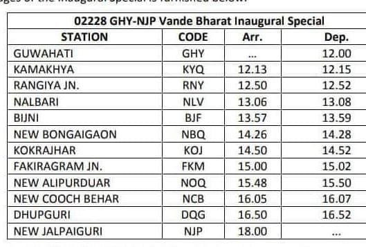 गाड़ी के नियमित परिचालन के पूर्व दिनांक 29 मई को गुवाहाटी से वन्देभारत के उद्धाटन विशेष रन का आयोजन किया गया है। यह उद्धाटन विशेष दोपहर 12 बजे न्यू जलपाईगुड़ी के लिए चलेंगी और ततपश्चात 31 से नियमित दौड़ना शुरू कर देगी।