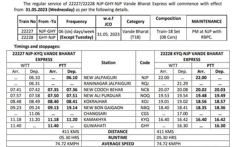 22227/28 न्यु जलपाईगुड़ी – गुवाहाटी – न्यु जलपाईगुड़ी वन्देभारत एक्सप्रेस सप्ताह में छह दिन, प्रत्येक मंगलवार छोड़कर चलाई जाएंगी। निम्नलिखित परिपत्रक में विस्तृत समयसारणी दी गयी है। यात्रीगण केवल PTT अर्थात पब्लिक टाइमटेबल के अनुसार समयसारणी समझे। WTT याने ‘वर्किंग टाइमटेबल’ रेल के परिचालन विभाग के लिए उपयोग में आता है।