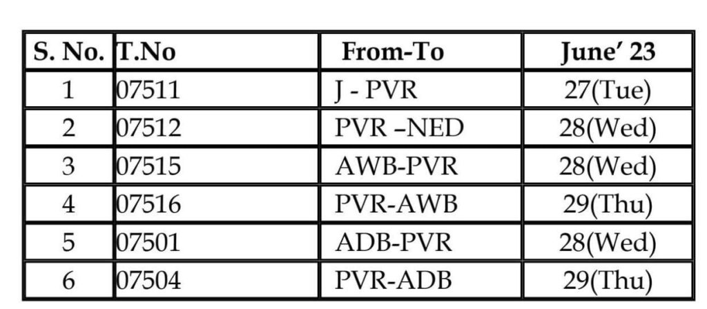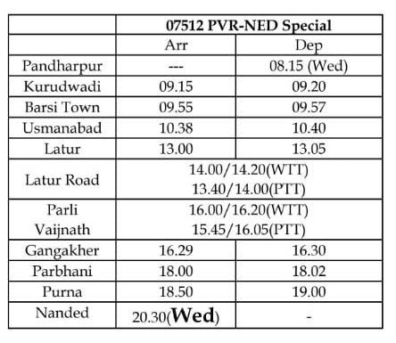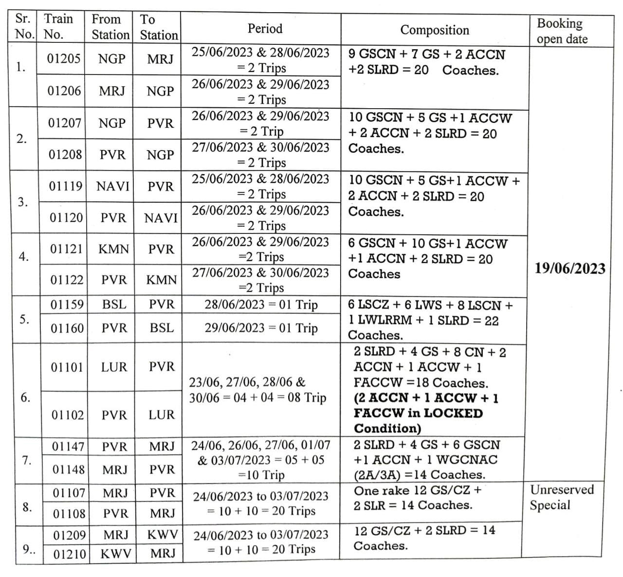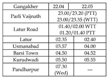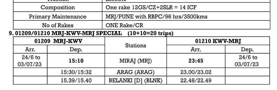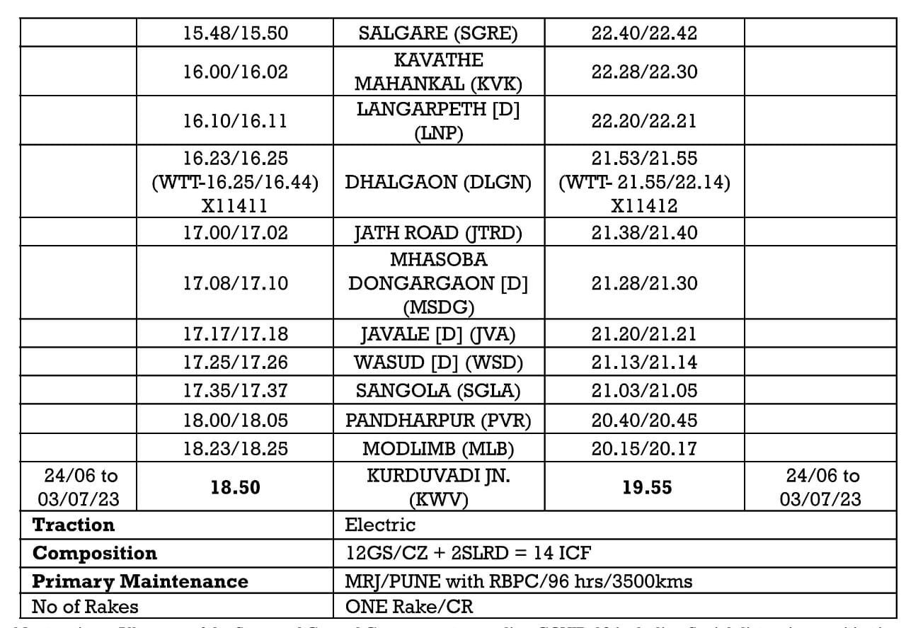 01147/48 मिरज – पंढरपुर – मिरज विशेष ; 01147 मिरजेहुन दिनांक 24, 26, 27 जून आणि 01, 03 जुलै ला, 01148 पंढरपुर हुन दिनांक 24, 26, 27 जून आणि 01, 03 जुलै ला सूटेल.