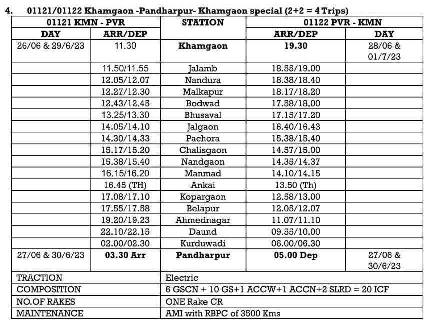 01121/22 खामगांव – पंढरपुर – खामगांव विशेष ; 01121 खामगांवहुन दिनांक 26 आणि 29 जून ला, 01122 पंढरपुर हुन दिनांक 27 आणि 30 जून ला सूटेल.