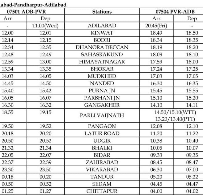 07501/04 आदिलाबाद – पंढरपुर – आदिलाबाद विशेष ; 07501 आदिलाबादहुन 28 जून ला आणि 07516 पंढरपुर हुन दिनांक 29 जून ला सूटेल.