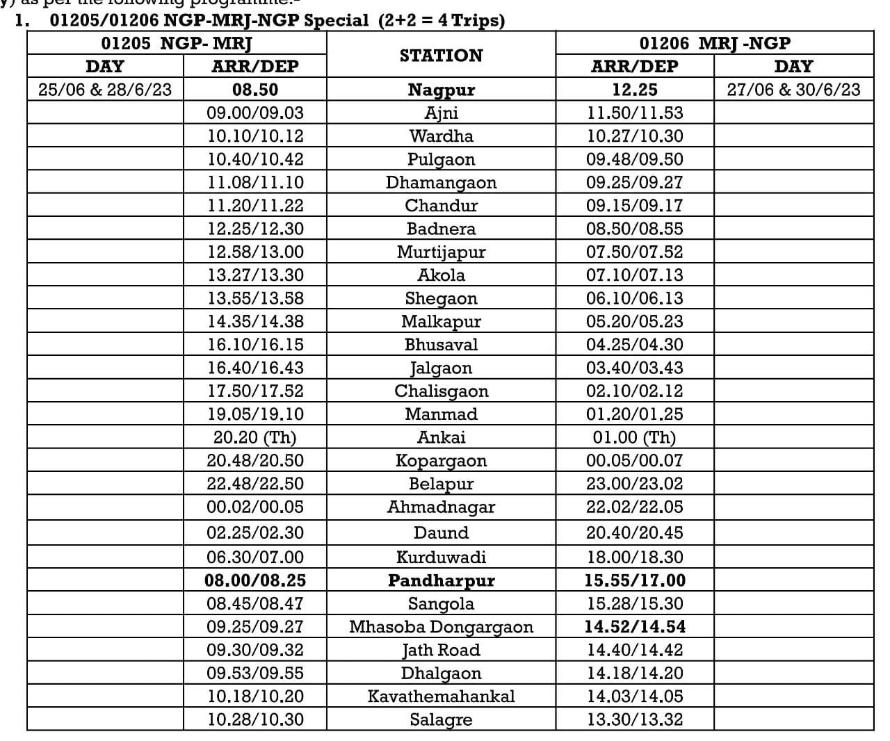 01205/06 नागपुर – पंढरपुर – मिरज – पंढरपुर – नागपुर विशेष ; 01205 नागपुर हुन दिनांक 25 आणि 28 जून ला, 01206 मिरज,पंढरपुर हुन दिनांक 26 आणि 29 जून ला सूटेल.