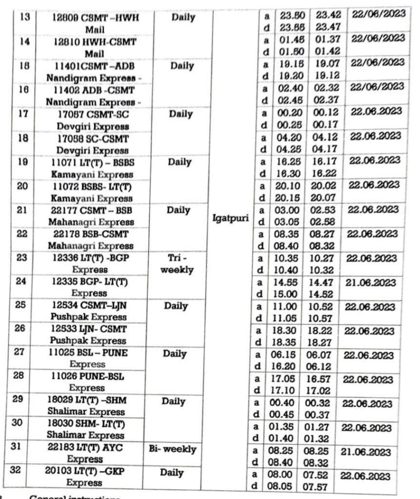 मध्य रेल मुख्यालय ने इगतपुरी स्टेशनपर तकनीकी कार्य हेतु रुकने वाली 16 जोड़ी अर्थात 32 गाड़ियों का स्टॉपेज अब वाणिज्यिक रूप में बदल दिया है।
