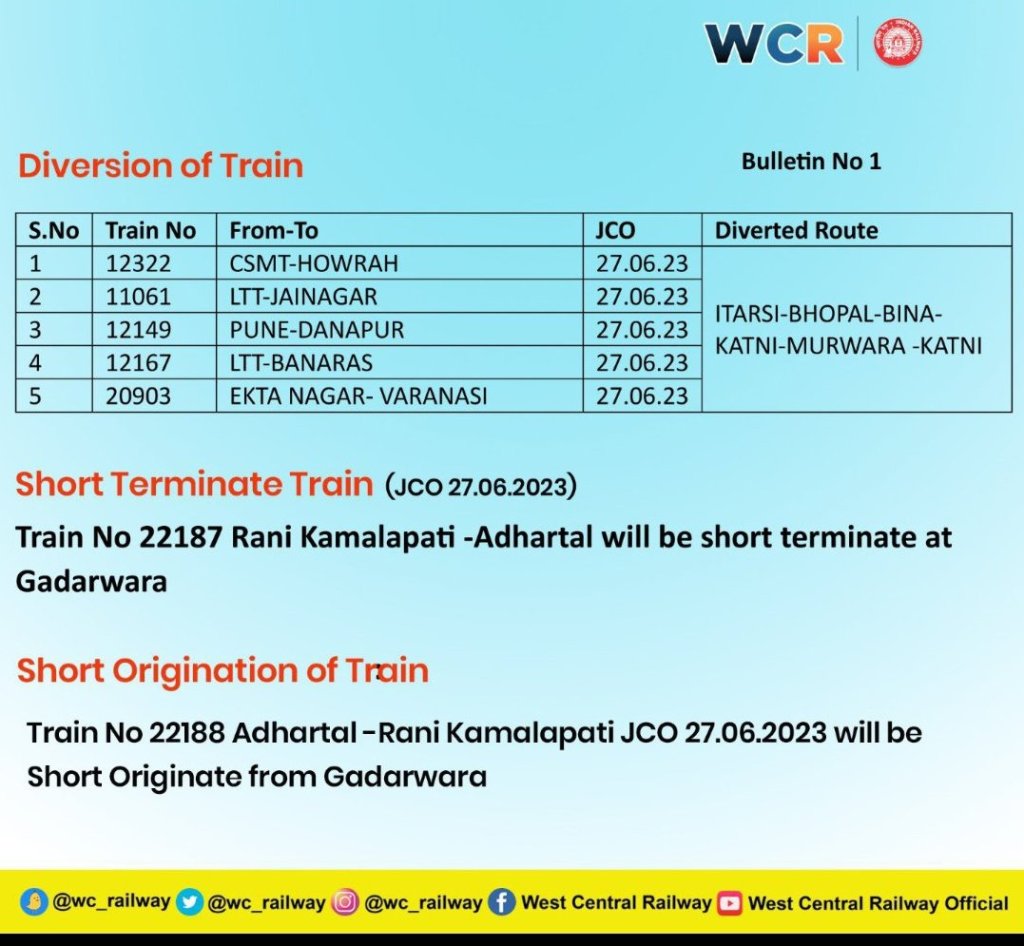 दानापुर पुणे, बनारस लोकमान्य तिलक टर्मिनस सहित कई ट्रेनें जबलपुर से कटनी बीना,भोपाल होकर इटारसी आयेगी और इटारसी से आगे अपने नियमित मार्ग से आगे बढ़ेगी।