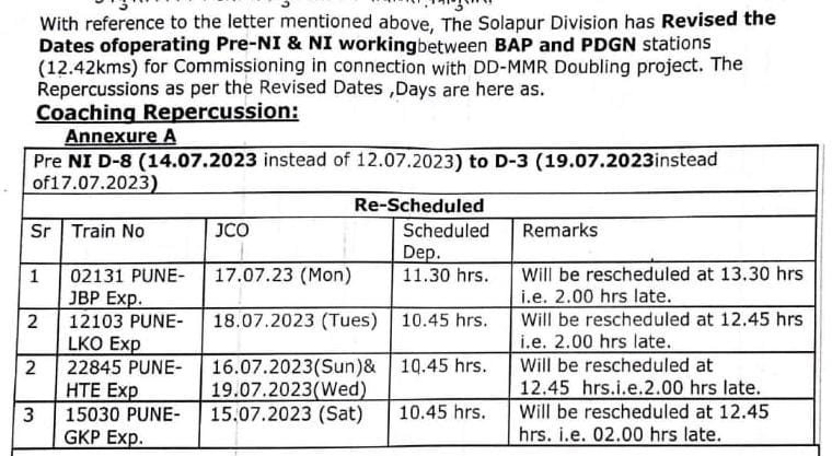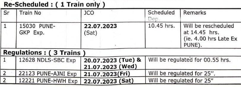 2: 22845 पुणे हटिया द्विसाप्ताहिक सुपरफास्ट दिनांक 16 जुलाई रविवार एवं 19 जुलाई बुधवार को पुणे जंक्शन से अपने नियमित समय 10:45 की जगह 2 घण्टे देरी से अर्थात दोपहर 12:45 को रवाना की जाएगी।