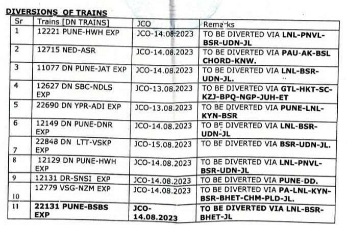 1) 12221 पुणे हावड़ा दुरंतो सुपरफास्ट एक्सप्रेस, JCO दिनांक 14/08/2023 पुणे से भुसावल के बीच परावर्तित रहेगी। दौंड कॉर्ड, मनमाड के बजाय लोनावला, पनवेल, वसई रोड, उधना, जलगांव के रास्ते चल कर भुसावल आएगी और आगे नियमित मार्ग से हावडा की ओर चलेगी।