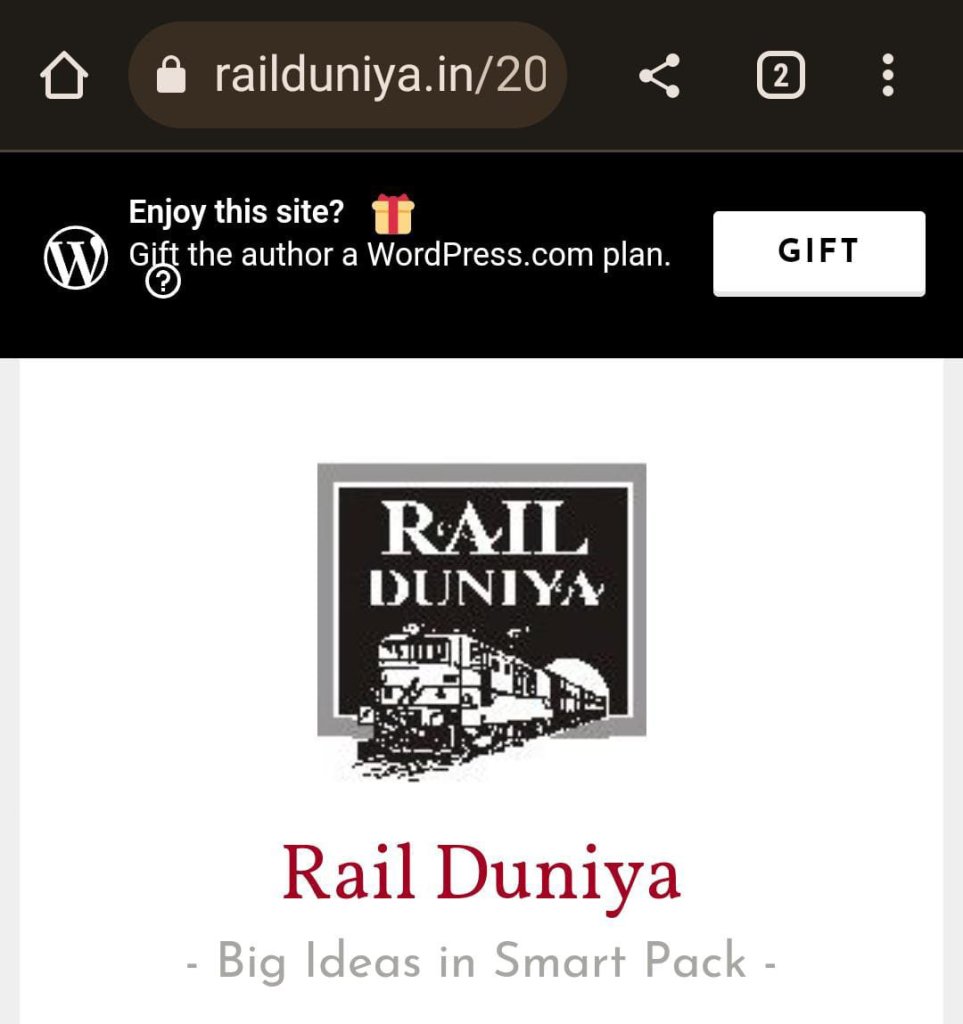 मित्रों, ‘वर्ड प्रेस’ यह प्लेटफार्म जिसके जरिए हम आपके सामने आते है, उन्होंने एक योजना बनाई है। जब हमारी वेबसाइट पर पहुंचते है तो शीर्षक के ऊपर एक विण्डो प्रकट होती है, जिसमे लिखा है, “आप रेल दुनिया वेबसाइट का आनन्द ले रहे है? तो ‘वर्ड प्रेस’ के वार्षिक प्लान को आप इन वेबसाइट के लेखक को गिफ़्ट कर सकते है।” 😁