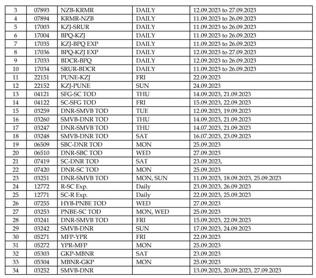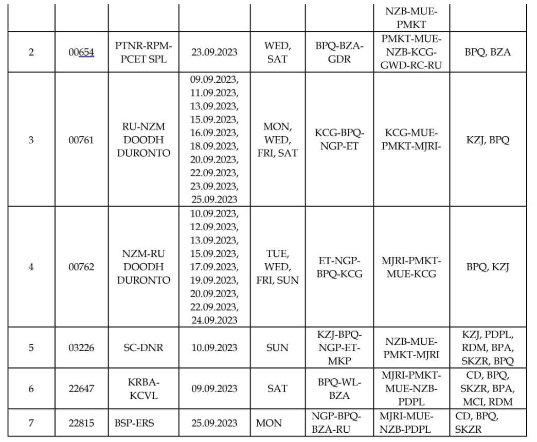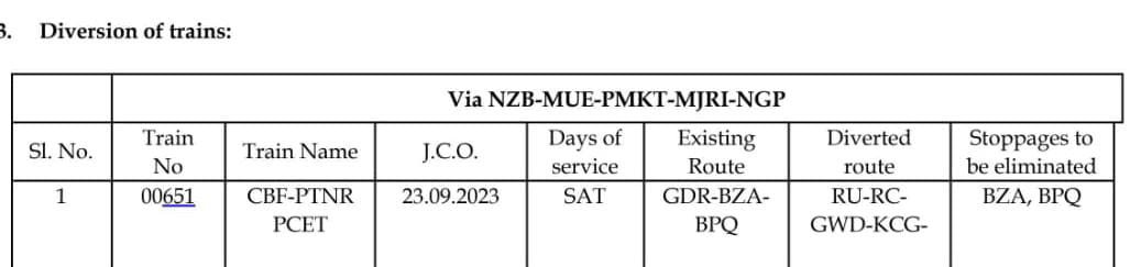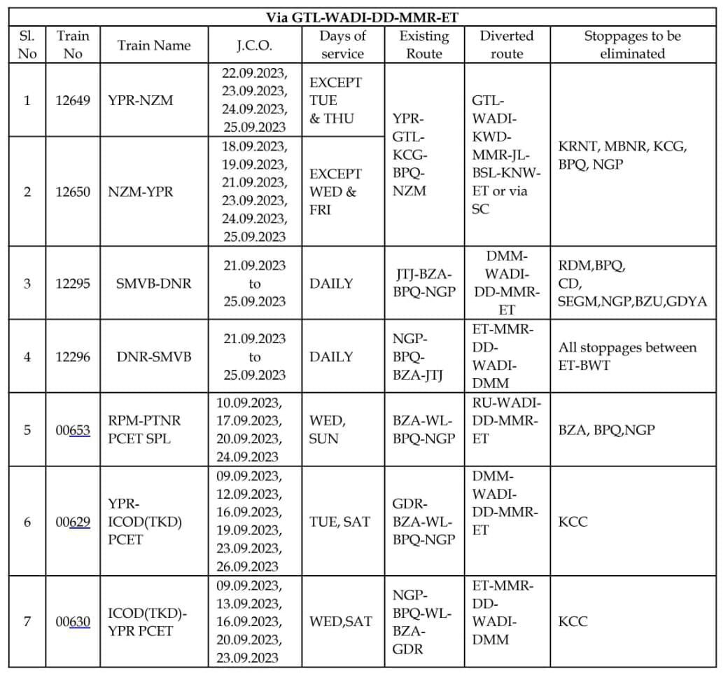 3: मार्ग परिवर्तन : निम्नलिखित 7 गाड़ियाँ निजामाबाद, मुदखेड़, पिम्पलकुट्टी, माजरी, नागपुर होकर चलाई जाएगी।