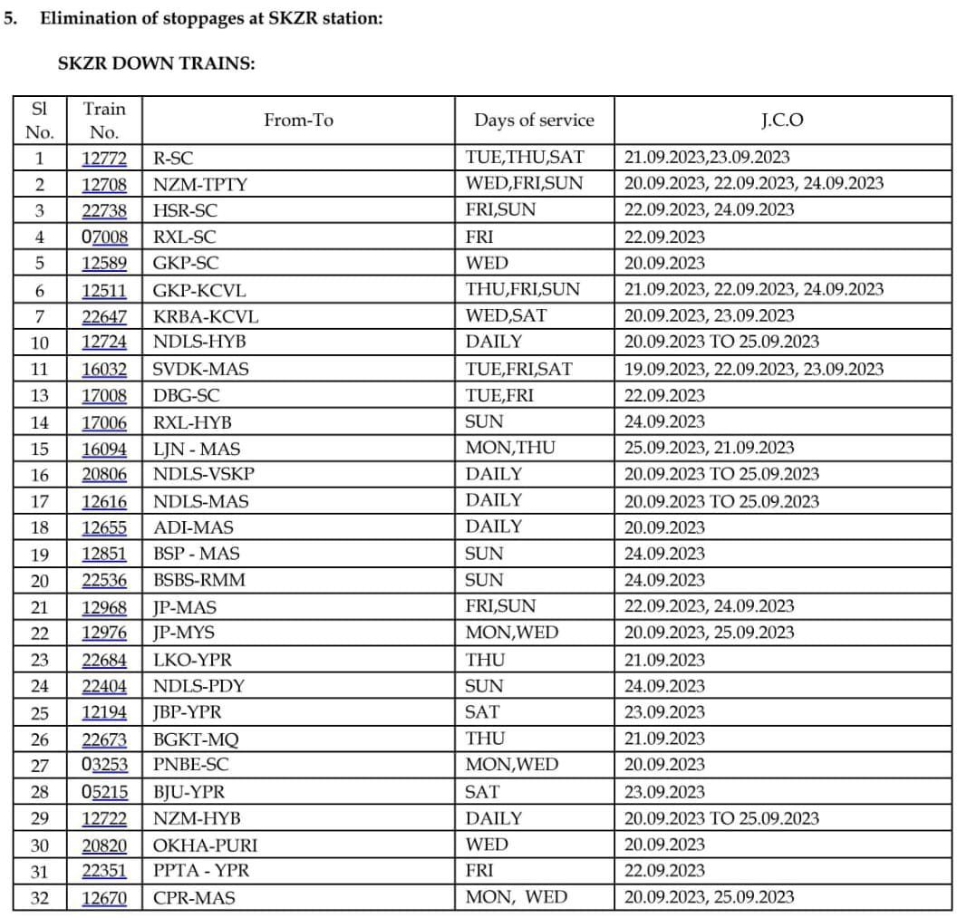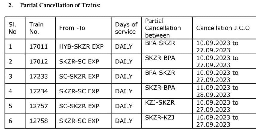 17233/34 सिकन्दराबाद शिरपुर कागजनगर सिकन्दराबाद भाग्यनगर एक्सप्रेस बेलमपल्ली से शिरपुर कागजनगर दिनांक 10 से 28 सितंबर के बीच रद्द रहेगी।