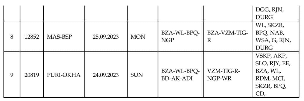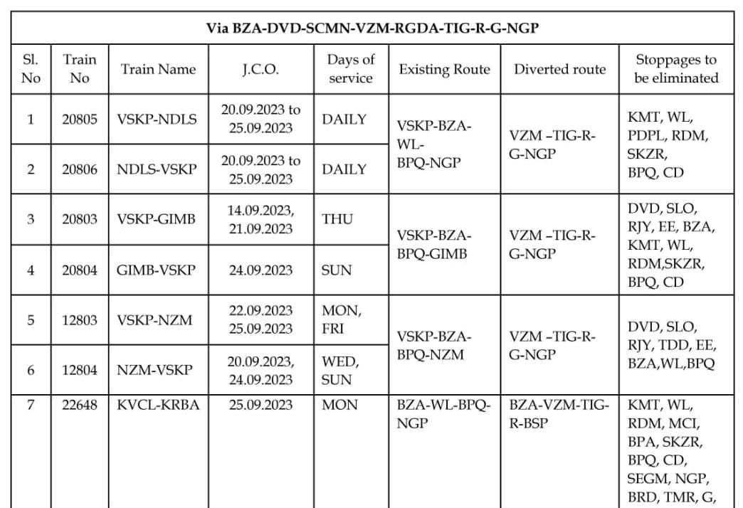 मार्ग परिवर्तन : निम्नलिखित 9 गाड़ियाँ विजयवाड़ा, दुव्वाड़ा, सिम्हाचलम, रायागड़ा, टिटलागढ़, रायपुर, गोंदिया, नागपुर होकर चलाई जाएगी।