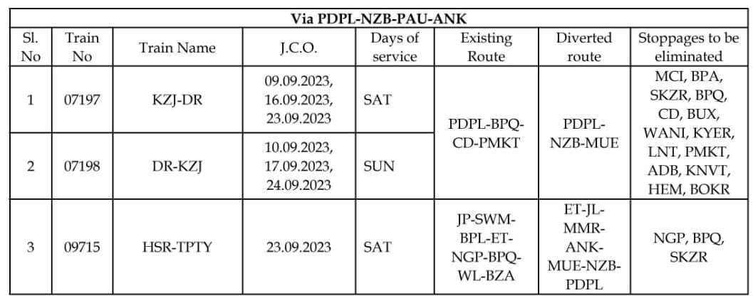 मार्ग परिवर्तन : निम्नलिखित 3 गाड़ियाँ पेड़ापल्ली, निजामाबाद, पूर्णा, अंकाई होकर चलाई जाएगी।