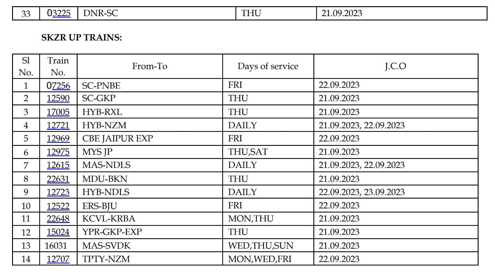 निम्नलिखित परावर्तित गाड़ियोंमे केवल 22647 कोरबा कोचुवेली एक्सप्रेस JCO 09/9/23 और 22815 बिलासपुर एर्नाकुलम एक्सप्रेस JCO 25/9/23 यह दो ही गाड़ियाँ है।