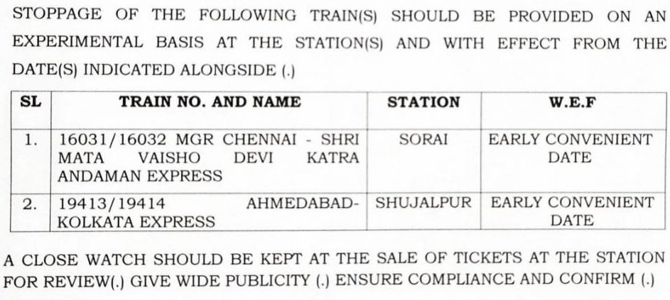 निम्नलिखित अस्थायी स्टापेजेस की घोषणा की गई है और जल्द ही स्थानीय रेल प्रशासन उनके समयसारणी घोषित कर देंगी।