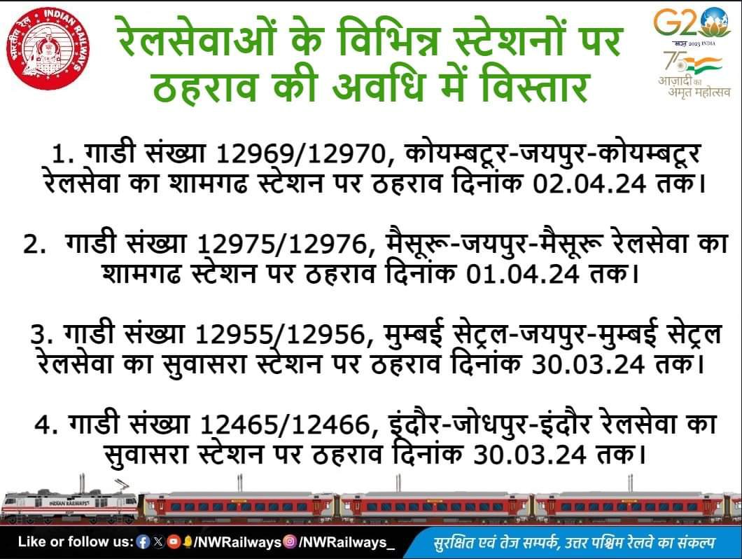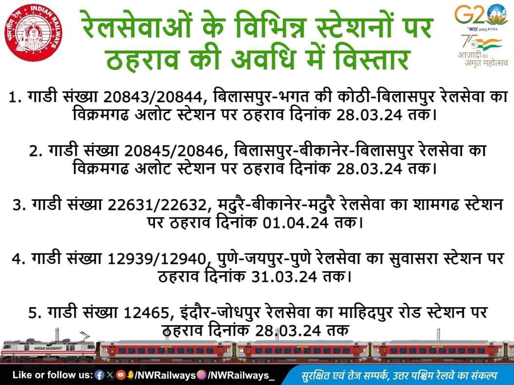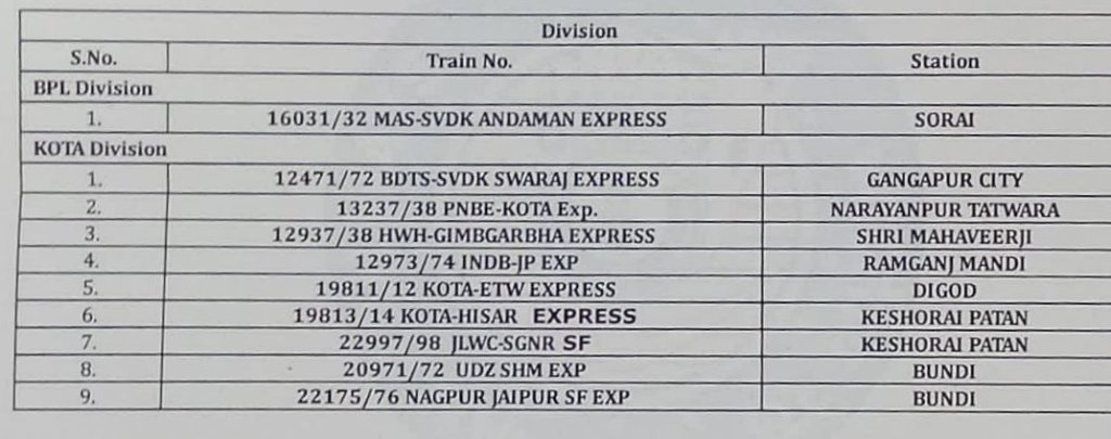 रेल प्रशासन के पमरे WCR, परे WR ने अपने स्टेशनोंपर यात्रिओंकी प्रलम्बित मांगों के मद्देनजर, कई गाड़ियोंके स्टापेजेस पुनर्स्थापित, अवधि में विस्तार किए है।