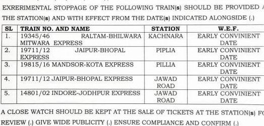 19711/12 जयपुर भोपाल जयपुर प्रतिदिन एक्सप्रेस एवं 14801/02 इन्दौर जोधपुर इन्दौर प्रतिदिन एक्सप्रेस का जावद रोड स्टेशन पर ठहराव।