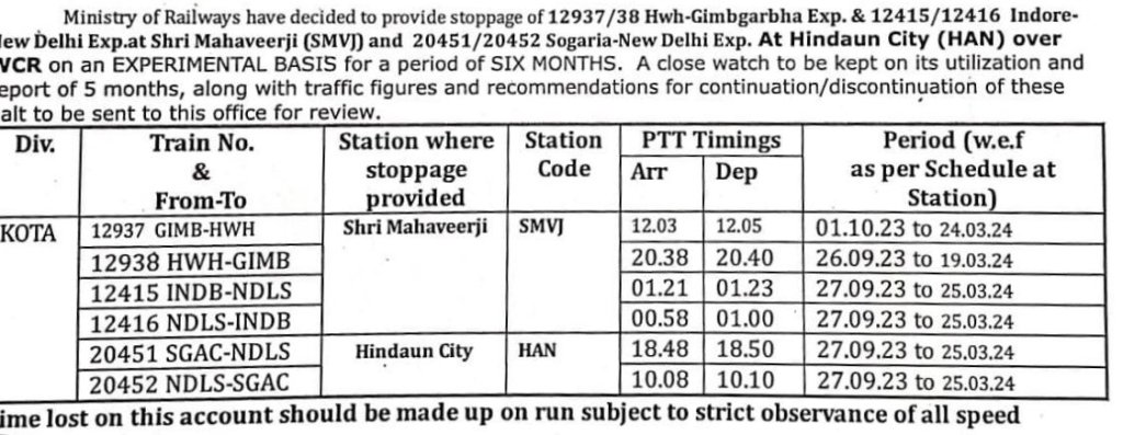 हिण्डौन सिटी : 20451/52 सौगारिया नई दिल्ली सौगारिया प्रतिदिन एक्सप्रेस दोनोंही दिशाओं में दिनांक 27 सितम्बर से ठहराव लेंगी।