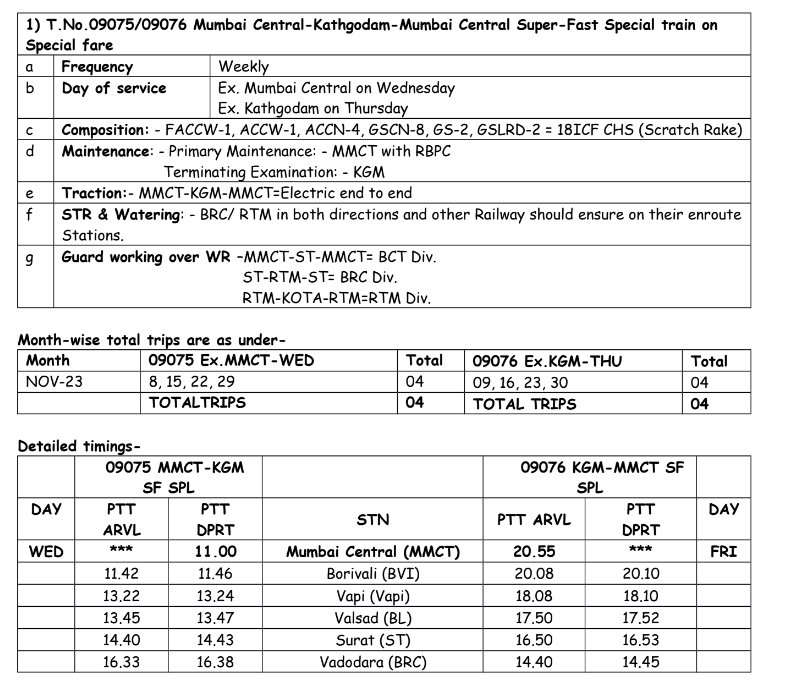 09075 मुम्बई सेंट्रल से दिनांक 08 से 29 नवम्बर तक प्रत्येक बुधवार को काठगोदाम के लिए 11:00 बजे रवाना होगी और वापसी में 09076 काठगोदाम से दिनांक 09 से 30 नवम्बर तक प्रत्येक गुरुवार को 17:30 बजे मुम्बई सेंट्रल के लिए रवाना होगी। यह कुल चार फेरे होंगे।