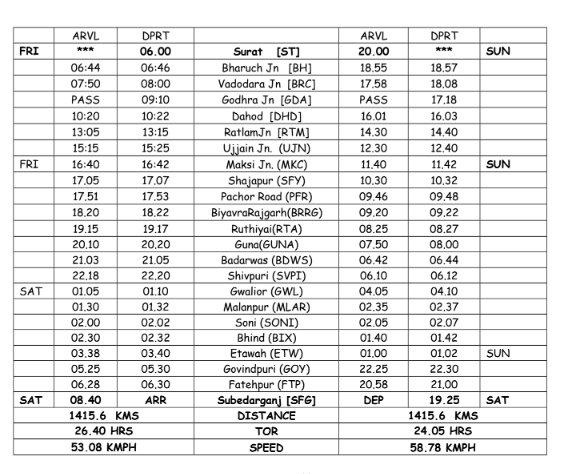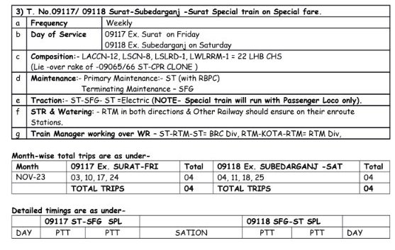 09117 सूरत से दिनांक 03 से 24 नवम्बर तक प्रत्येक शुक्रवार को 6:00 बजे सूबेदारगंज के लिए रवाना होगी और वापसी में 09118 दिनांक 04 से 25 नवम्बर तक प्रत्येक शनिवार 19:25 को सूबेदारगंज से सूरत के लिए रवाना की जाएगी। कुल चार फेरे रहेंगे।